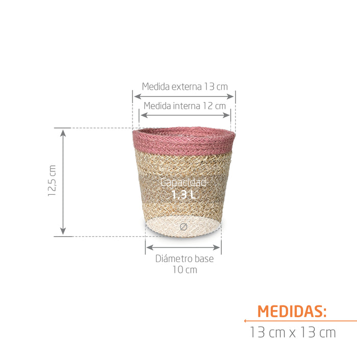 La Cesta Cilindro de Yute 13 x 13 cm Rosa aporta un toque de color y textura a tus espacios. Tejida a mano con fibras de yute tintadas de forma natural en un delicado tono rosa, combina ligereza y resistencia. Ideal para cubrir materas pequeñas, organizar accesorios o decorar repisas, suma calidez y un aire femenino y sostenible a tu decoración.
